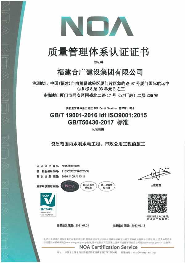 福建合廣建設(shè)集團(tuán)有限公司,注冊資本5188萬元人民幣,公司位于廈門市同安區(qū)鳳山一里151-17號。本公司成立于2013年,公司具備市政公用工程、水利水電工程、房屋建筑工程、公路工程、園林綠化等多專業(yè)施工資質(zhì)。企業(yè)從業(yè)人員100多人,各類專業(yè)技術(shù)人員70多人,其中高級職稱8人,中級職稱40多人,一級建造師6人,二級建造師15多人。